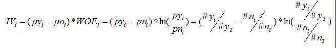 IV值(Information Value)主要用来对输入变量进行编码和预测能力评估。特征变量IV值的大小即表示该变量预测能力的强弱。计算逻辑就是以WOE为基础进行计算的。网上关于iv的计算也比较多,在这里也就不在细说。