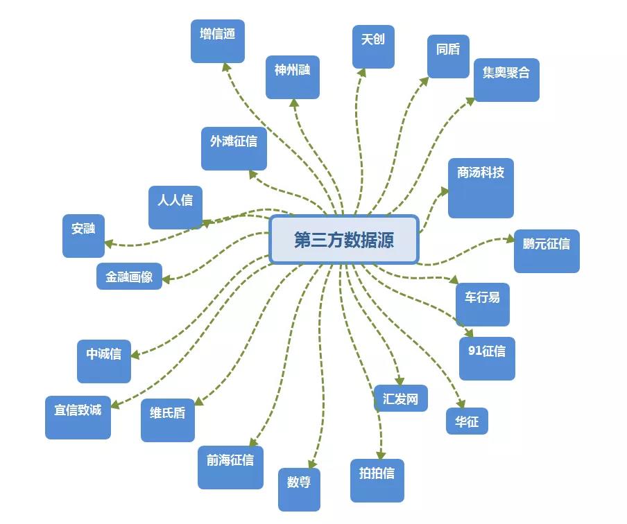 数据作为一家信贷公司把控风险已经越来越重要了,特别是对线上获客的企业而言。我们如何判断一个客户是否有足够的还款能力与还款意愿,如果仅仅只有三要素来决定别人还不还钱,其实跟随机买张六合彩的能中奖的情况一样,咱心里没底。所以有时为了获得一个有效的客户,我们会接入了N多个数据源,所以这也同时推高了征信成本的费用 。比如在某集团公司里就会接入以下这些数据源: