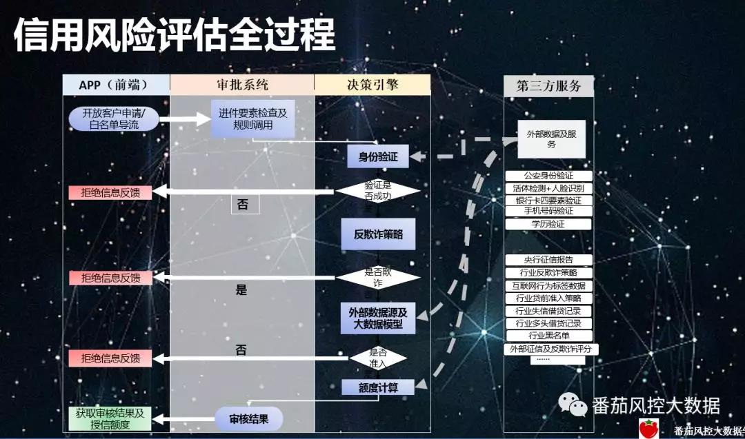 具体涉及的风险评估流程主要涉及进件端系统、审批系统、决策引擎系统、第三方服务等几个模块进行交互和数据验证