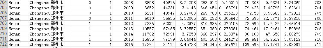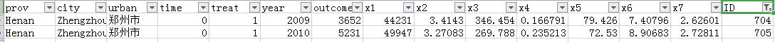 下面是其中一组数据 一共有97组,97个城市,第四列为时间time,第五列为Treat