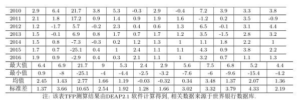 \multicolumn{13}{c}{注: 该表TFP测算结果由DEAP2.1 软件计算得到, 相关数据来源于世界银行数据库. }