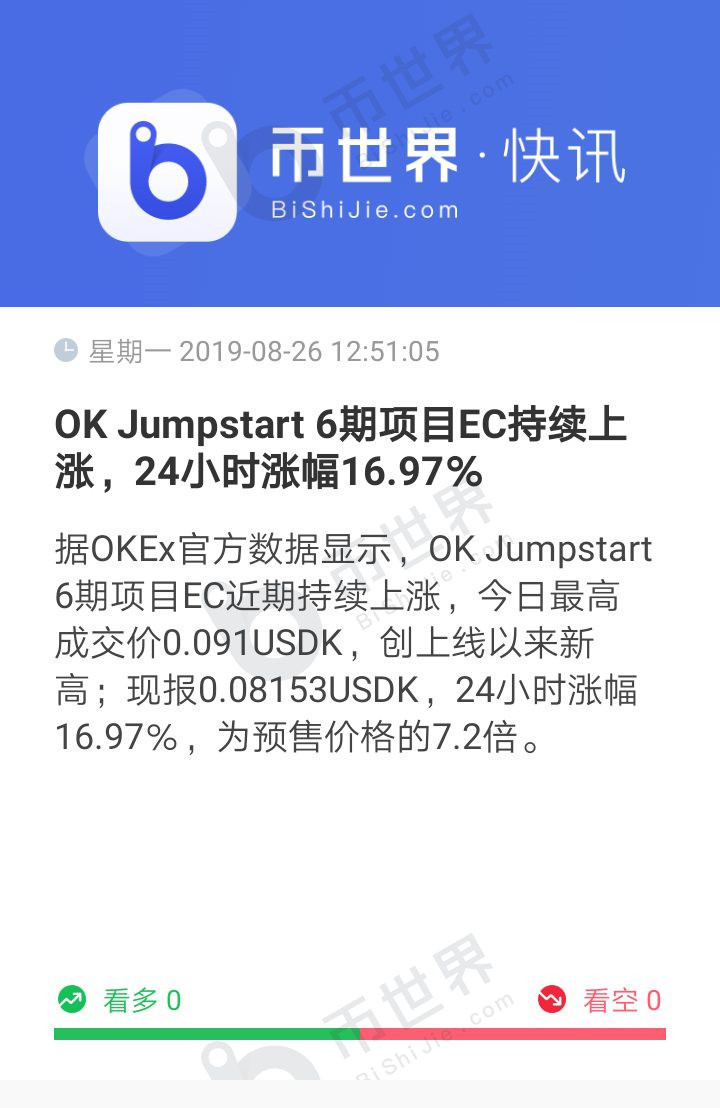 刚看了币世界的快讯,OK第6期项目EC一直在持续上涨,最高的成交价已经达0.091USDK了,是预售价格的7.2倍,创新高了,当时犹犹豫豫没上车,现在肠子都要悔青的了,唉,不知道下一次OK的IEO项目什么时候上?