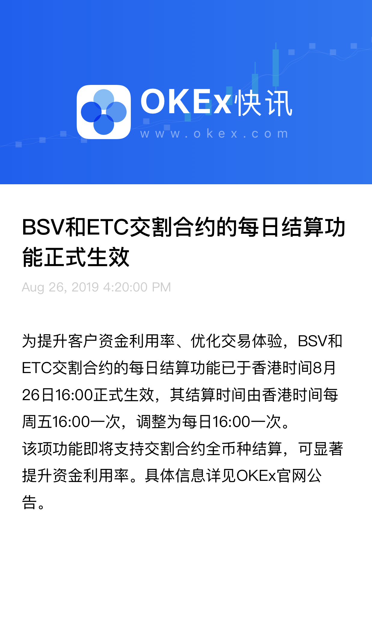 为提升客户资金利用率、优化交易体验,BSV和ETC交割合约的每日结算功能已于香港时间8月26日16:00正式生效,其结算时间由香港时间每周五16:00一次,调整为每日16:00一次。具体信息详见OKEx官网公告!