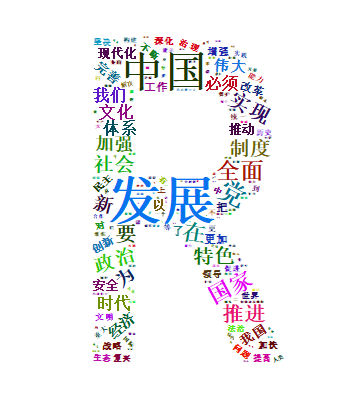 环形图可以看出,“人民”、“发展”和“建设”等词语字体较大,说明出现次数较高。进一步对形状进行设置,选择单词“R”和党徽形状进行分析,具体如下:
