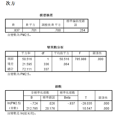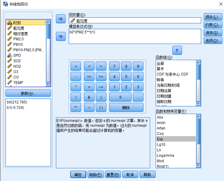 我用SPSS里的分析→回归→曲线估计对两组数据数据PM2.5和能见度进行 幂 曲线估计,然后它给我了拟合值R方和参数估计值b0、b1。