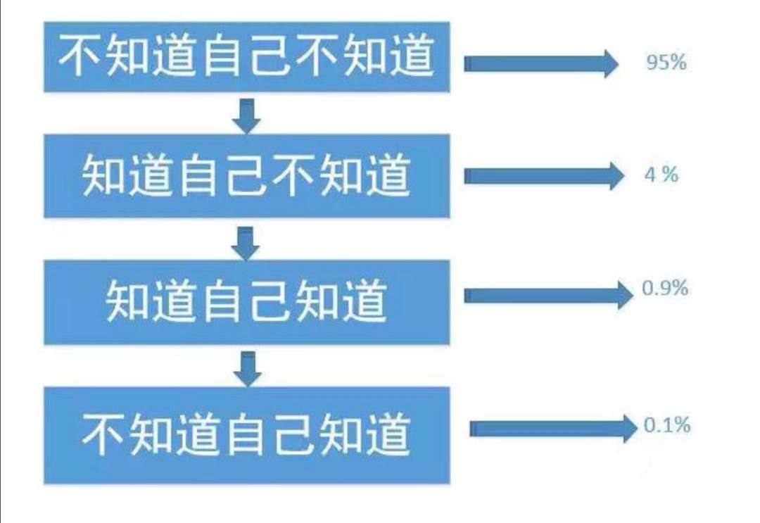 不知道自己不知道——以为自己什么都知道,自以为是的认知状态。(这是大多数初入股市散户的认知状态,认为投资很容易)