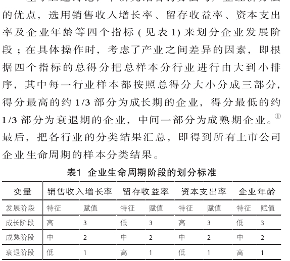 法二:销售收入增长率、留存收益率、资本支出率及企业年龄等四个指标划分企业发展阶段
