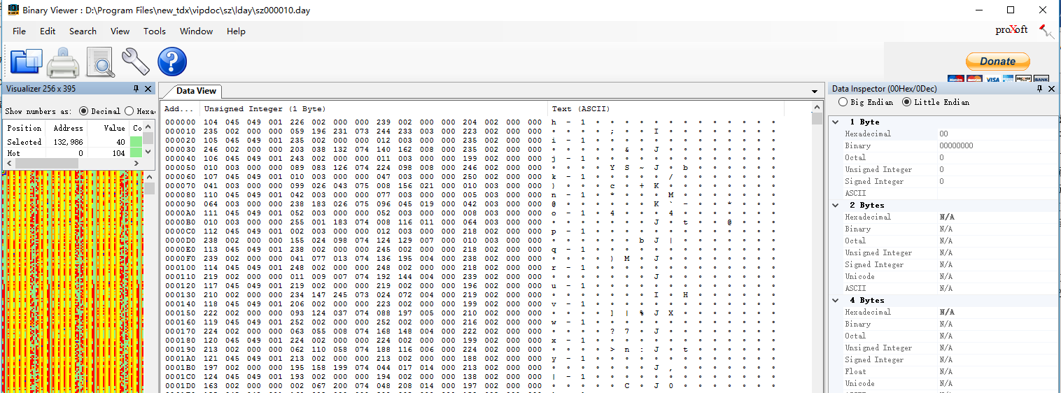 利用scan命令读取文档,得到相似的结果。可以看出,这种数据经分析发现是与二进制相关的文档,无法用正常的方法打开,需要借助其他方法。要正确读取文档,首先要了解文档具体内容,此时需要借助其他软件。一般显示乱码的文件可以用二进制查看工具。此处继续发扬免费的精神,用Binary Viewer软件进行分析。具体选择不同选项进行查看,然后对比其结果是否与通信达软件中显示的数据是否一致。此处具体以sh000010.day数据,初步分析应该是对应上交所上市的股票代码为000010的数据,即美丽生态股票数据,利用Binary Viewer打开后得到的结果如图所示。