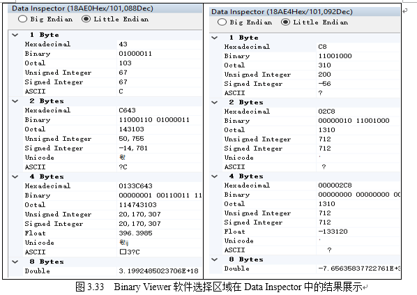 其中machine=’hex’表示数据原编码模式是16进制,即机器识别方式, human表示输出读者可以识别的模式,具体为字符形式,size表示转换为读者可以识别的形式,这种用integer,即整数形式,size表示源数据的格式。经过BinaryViewer查看,这些数据内容应该为整数形式,即human为int形式,且4字节,endian为little。基于此,对应的命令为: