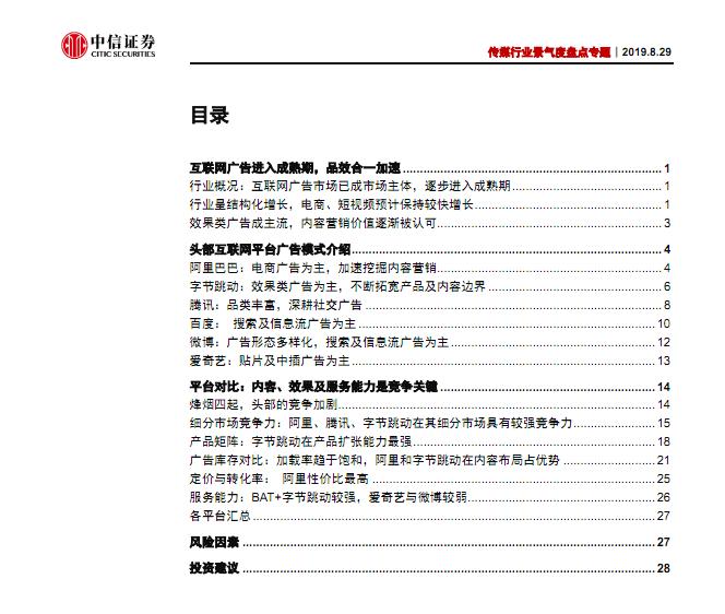 中信证券-传媒行业景气度盘点专题:互联网广告战火将起,头部平台鹿死谁手-20190829-34页.pdf