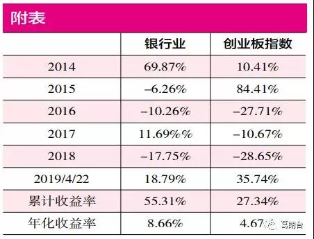 再联想到国内A股市场上一直被悲观预期所笼罩的“银行股”。近年来, “宏观经济的行”,“银行业的坏账”, “中小企业的违约”种种利空打压着银行股,使其始终围绕着5-6倍的市盈率上下波动。另一方面,银行的商业模式不存在太多的创新,服务不人性化也屡屡被人诟病,其价值远比不上和“金融科技”挂钩的概念股公司。但另一方面,银行业整体的股票在近5年多取得 了年化8.66%的回报率(见附表),在A 股所有行业中名列前茅,仅次于消费、 家电等行业,没有“价值”的银行股何以取得如此高的“投资价值”?这又是 一个令人深思的案例。