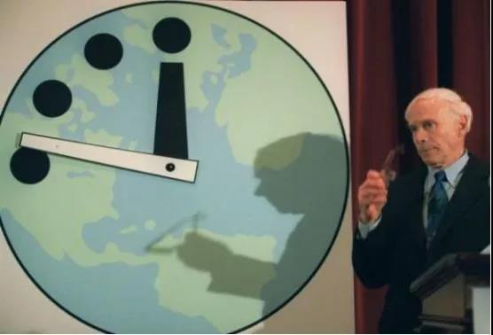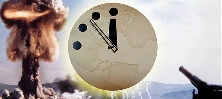 末日钟是由《原子科学家公报 》(Bulletin of the AtomicScientists)杂志于 1947 年所设立,旨在象徵核武威胁的紧迫性。在杂志的封面上,有个指针快指向午夜的时钟,好似原子弹的倒数计时一般。