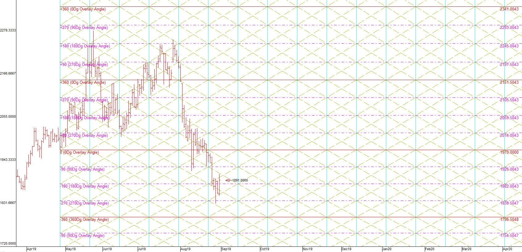 Thesecond FLD pattern sequence (ref #1) projects a price movement UP to a targetof 2012.98 by about 2019/9/9. This move would imply a 2-tier cascade of price crossesover the 8 day to 17 day FLDs (est: 2019/8/31 & level: 1910.05) . Thisprice move breaks above the 4 day, and the 8 day, and the 17 day VTL implyingthat the price trough of 1831 on 2019/8/28 is the expected trough of the 34 daycycle. Price might cross OVER the 34 day FLD on 2019/9/6 & level: 1958.93however this FLD cross is too late in the cycle to be considered valid, and soit is more likely that the FLD will form resistance at this level.