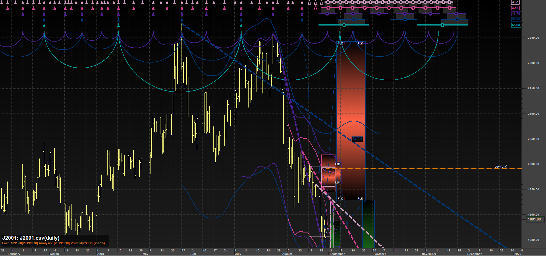 Price hasrisen over the past 1 bars (last close 1891) in an otherwise DOWNWARD pricemovement, with the FLD pattern indicating an impending UPWARD move, because: Itis possible that the first sequence of the FLD pattern has already beenfulfilled, by the low of 1831 on 2019/8/28 which would indicate that thesecond, UPWARD sequence of the pattern is now in progress.