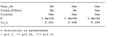 stats(Year_Fe Fixed_Effect Cluster N r2_a) varwidth(20) ///
