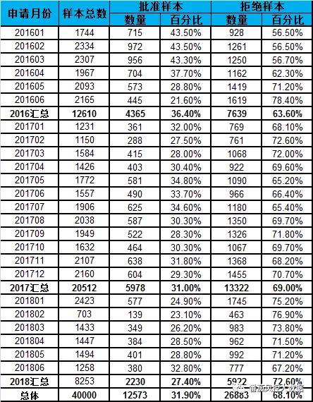 检测样本中,接受样本为10000条,拒绝样本为30000条。各月详细申请及批准情况见下表: