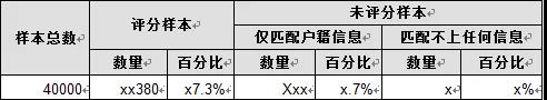 样本中,有97.3%的样本满足评分准入条件,剩下的2.7%的样本仅匹配到户籍信息,不满足评分准入条件,无法对其进行风险分数给定。具体如下: