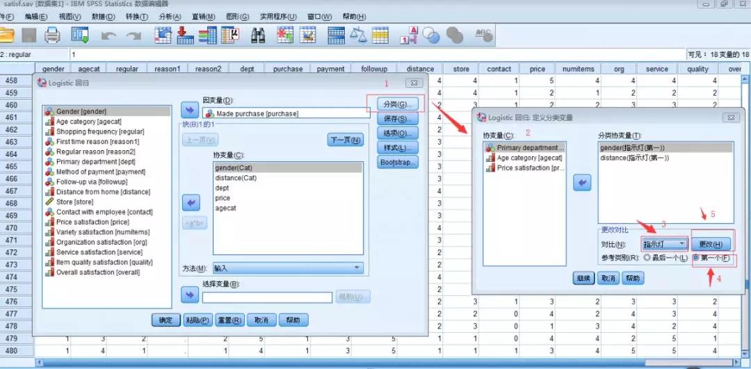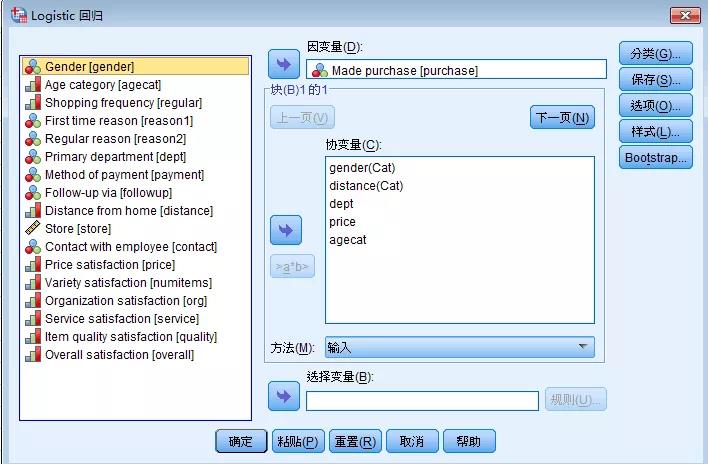 选取了purchase作为因变量,而此次为了操作简便只选取四个变量:sex, dept, price, distance;
