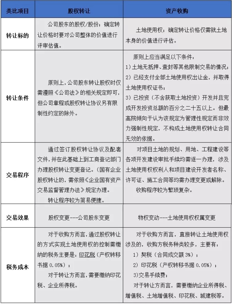 通过股权转让的方式实现对目标土地使用权受让的,因其真实交易目标是对土地使用权的受让,但与直接转让土地使用权的方式又存在上述众多差异,因此在实务中往往会产生很对争议,本文梳理如下: