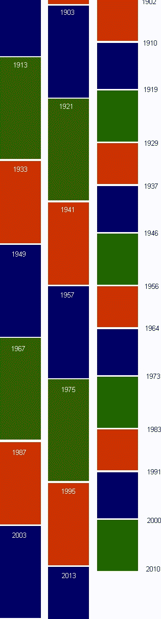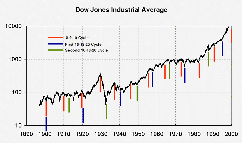 The first cycle goes: 8-years, 9-years, 10-years, and begins in 1902. Theprojected lows were forecast on 1902, (+8) 1910, (+9) 1919, (+10) 1929, (+8)1937, (+9) 1946, etc.