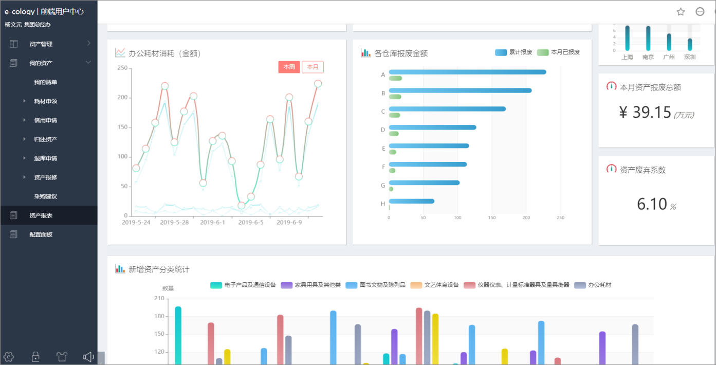 在OA系统门户上将入库及出库数量用可视化的报表进行呈现,资产消耗数量、金额直观展现。