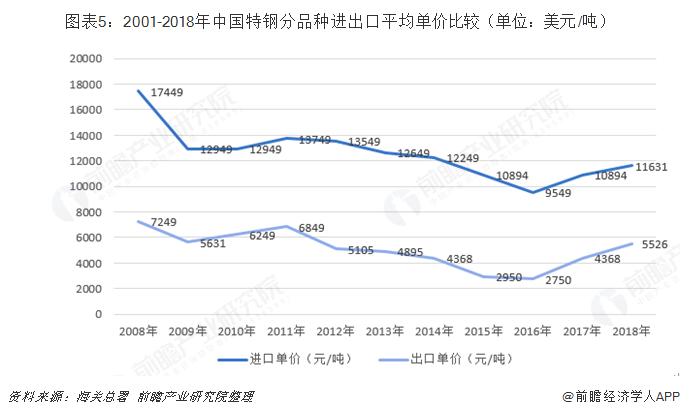 进出口产品价差印证我国特钢产品结构不足。在数量上来看,我国特钢出口规模庞大,2015年达到历史峰值6547万吨,规模与日本相当。我国特钢进口规模也较大,2015年开始逐年递增,2018年达到峰值404万吨。但从进出口产品的单价却暴露了我国特钢产品结构上的缺陷。2008-2018年,我国特钢进口产品平均价格偏低,表明我国高端特钢产品对外依存度较高,同时我国低端特钢在国际上具有较强竞争力,印证了我国特钢产品结构上的缺陷,未来我国特钢行业存在较大进口替代空间。