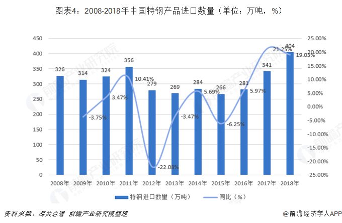 2018年我国特钢进口404万吨,占我国特钢年产量的比重约19%,同比增长19%,进口总额达到70亿美元。