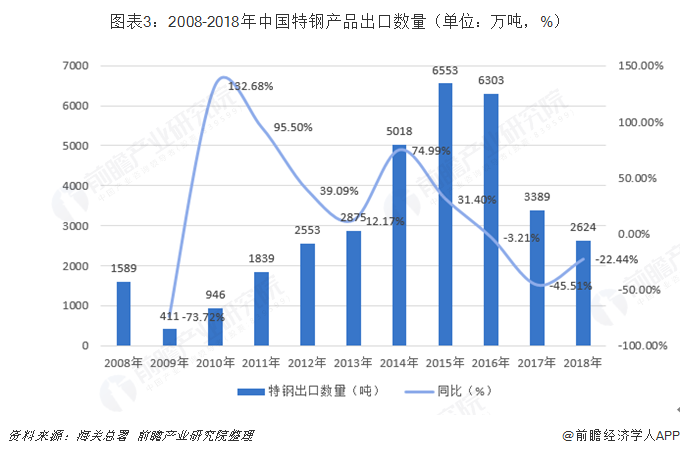2008-2018年中国特钢产品出口数量整体呈现增长趋势,2008年受次贷危机影响,出口量出现下跌,随后在2015年达到高峰。2018年中国特钢出口2624万吨,占我国特钢年产量比重为60%,出口总额为212亿美元。