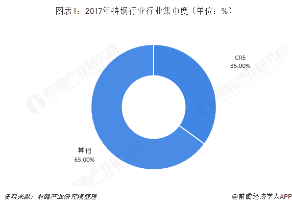 截至2017年,与发达国家相比,国内特钢行业的集中度较低。我国纳入特钢协会统计的32家特钢企业产量占特钢总产量的比重在60%~70%,前5大特钢企业,宝钢集团有限公司、河北钢铁集团有限公司、江苏沙钢集团有限公司、首钢总公司和武汉钢铁集团公司的特钢产量占比在35%左右,略高于普钢行业,但日本、欧盟等发达国家该数据在70%以上。我国特钢企业集中度较低,行业中小企业居多,大型专业化生产企业相对较少。