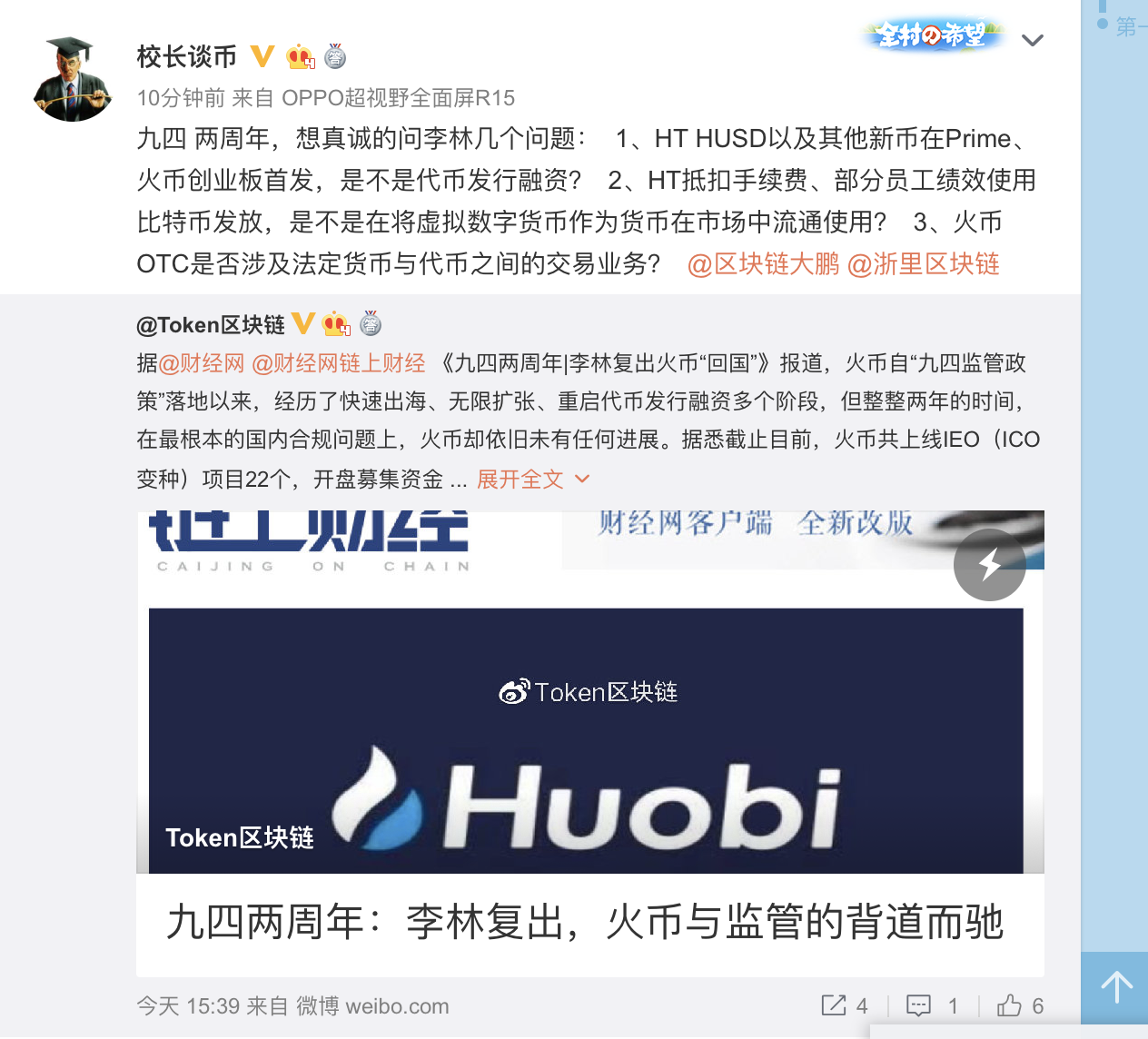 今天是94两周年,我们发现网上有媒体报道火币李林公开推销HT、频繁IEO主导多个代币发行融资。跟七部委“九四监管政策”相违背