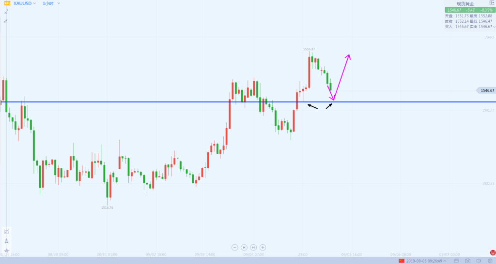 昨日,黄金再一次上演白天跌一天,晚间就变脸的行情,这波行情一路走来这种手法不少见,大涨之后,日内先走慢跌带走一批追多的人,而晚间看上去走弱了,实际没有确实破位关键点位,这时候在去追空又是一记反杀,先拉走追多的在带走追空的,最后达到上涨的真实目的,再一次刷新高点到达1556.9,这种走法弄不好就是左右打脸,而当黄金暴露真实目的只时,却没有勇气在去操作,左右打完总不能在来一次左右左,那样怕是脸都打肿了。