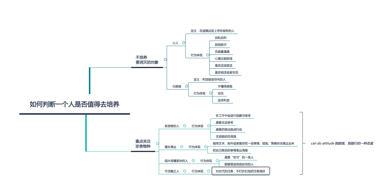 最后,对于什么样的人值得培养曾有一个这样的综合评价:即无论是有思想、擅长表达、顾大局还是可信赖,总结起来就是一句话:即can do attitude——就是我能做、我能行的一种态度。无论是大困难还是小困难,面对这些挑战,保持“我都能够做,我一定愿意去克服它”的心态去迎接挑战,那么这种人就一定是值得培养和发展的人。