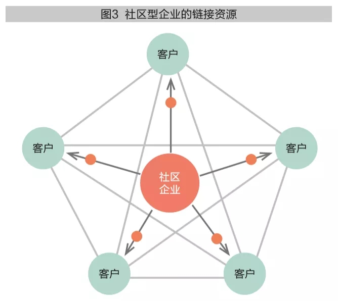 如图3所示,传统企业大多是在把产品和服务提供给自己的客户,如果只有五个客户,那这家企业经营的主要就是红点标出的五条链接。但如果这家企业为客户建立了一个可以互相链接的虚拟社区,就形成了15条链接,比原来多出了10条链接。并且随着客户量的增加,链接的数量会变成阶乘增加,从而急剧放大企业所拥有的链接资源。所以,数字经济时代的企业模型就是要思考如何利用新增加的大量链接资源,企业所提供的产品和服务也都要为建立和维持链接资源而服务。如果企业能在这些新增的链接资源上获取价值,那么在工业时代最初经营的边甚至可以放弃,这意味着该行业商业模式发生了彻底革命。