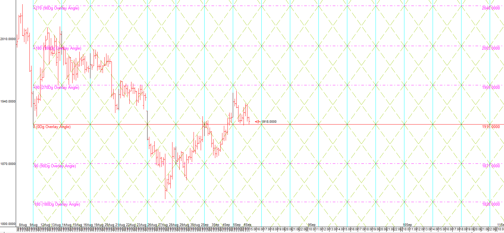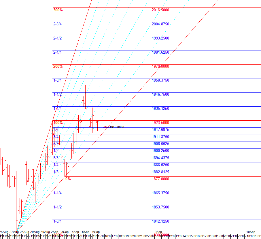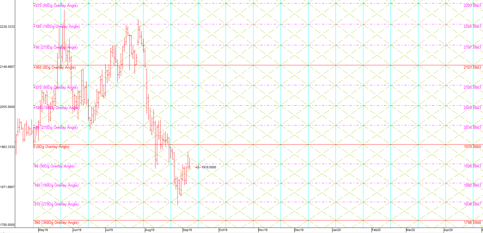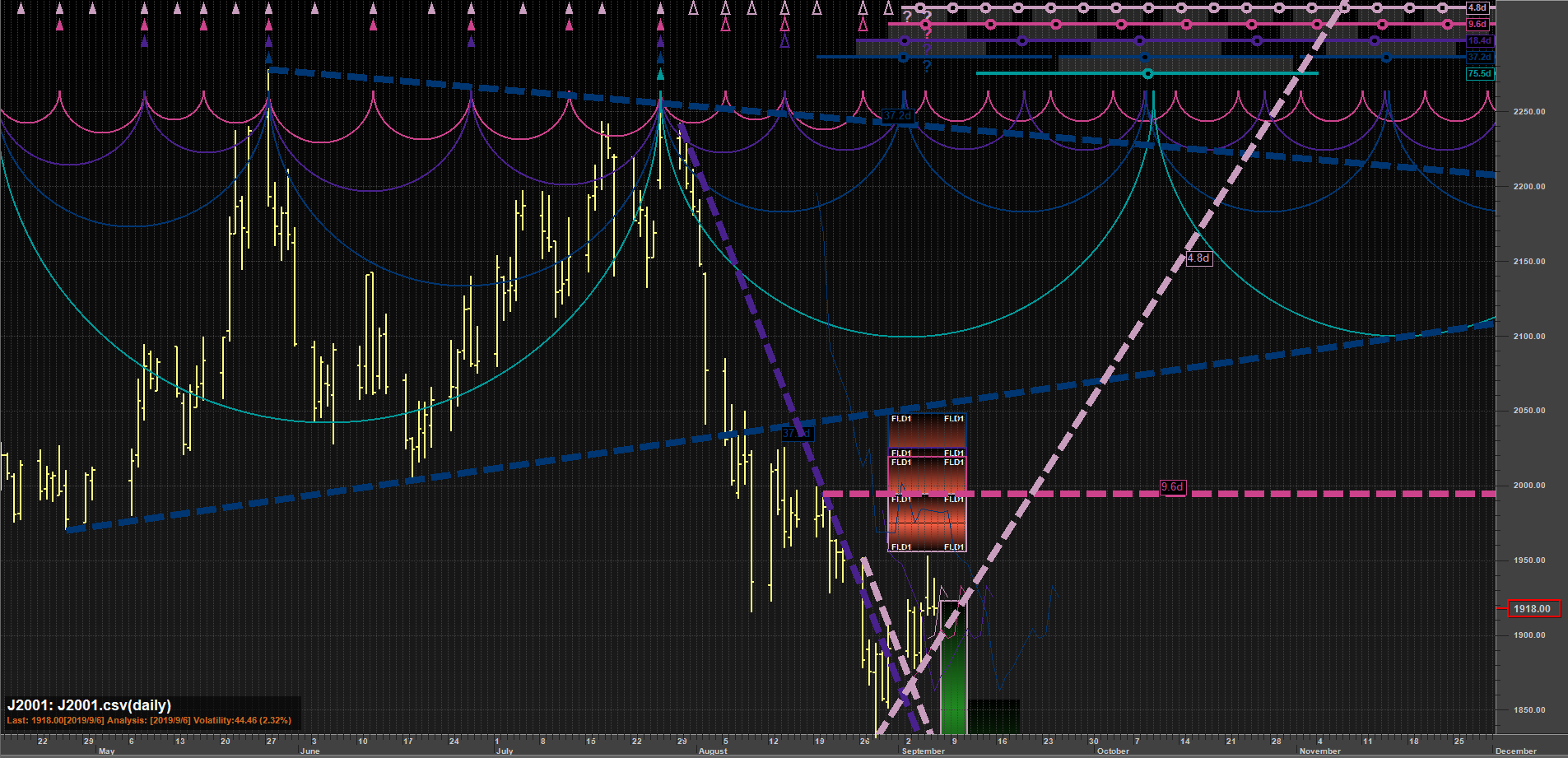 The first FLD pattern sequence (ref #0)projects a price movement DOWN to a target of 1736.82 by about 2019/9/28. Thismove would imply a 2-tier cascade of price crosses below the 4 day to 8 dayFLDs (est: 2019/9/7 & level: 1912.21) Price might cross UNDER the 17 day FLD on 2019/9/14 & level: 1902.67however this FLD cross is too late in the cycle to be considered valid, and soit is more likely that the FLD will form support at this level. Price mightcross UNDER the 34 day FLD on 2019/9/18 & level: 1896.28 however this FLDcross is too late in the cycle to be considered valid, and so it is more likelythat the FLD will form support at this level.