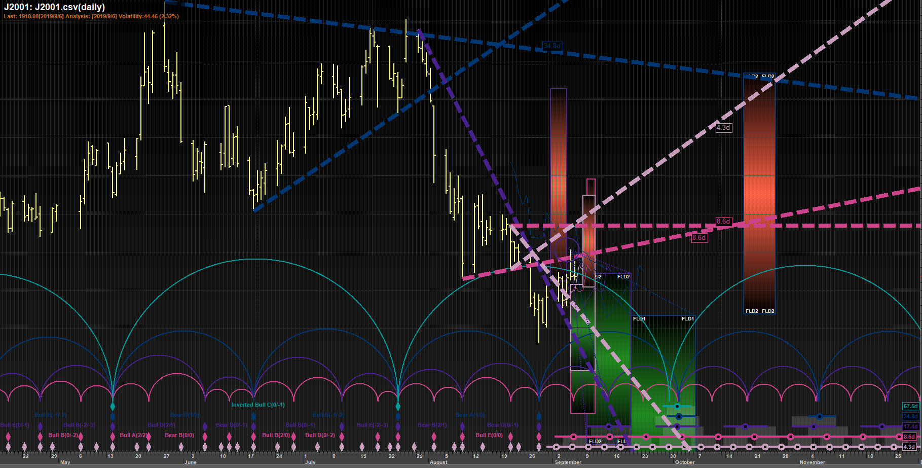 The second FLD pattern sequence (ref #1)projects a price movement UP to a target of 2026.20 by about 2019/10/22.