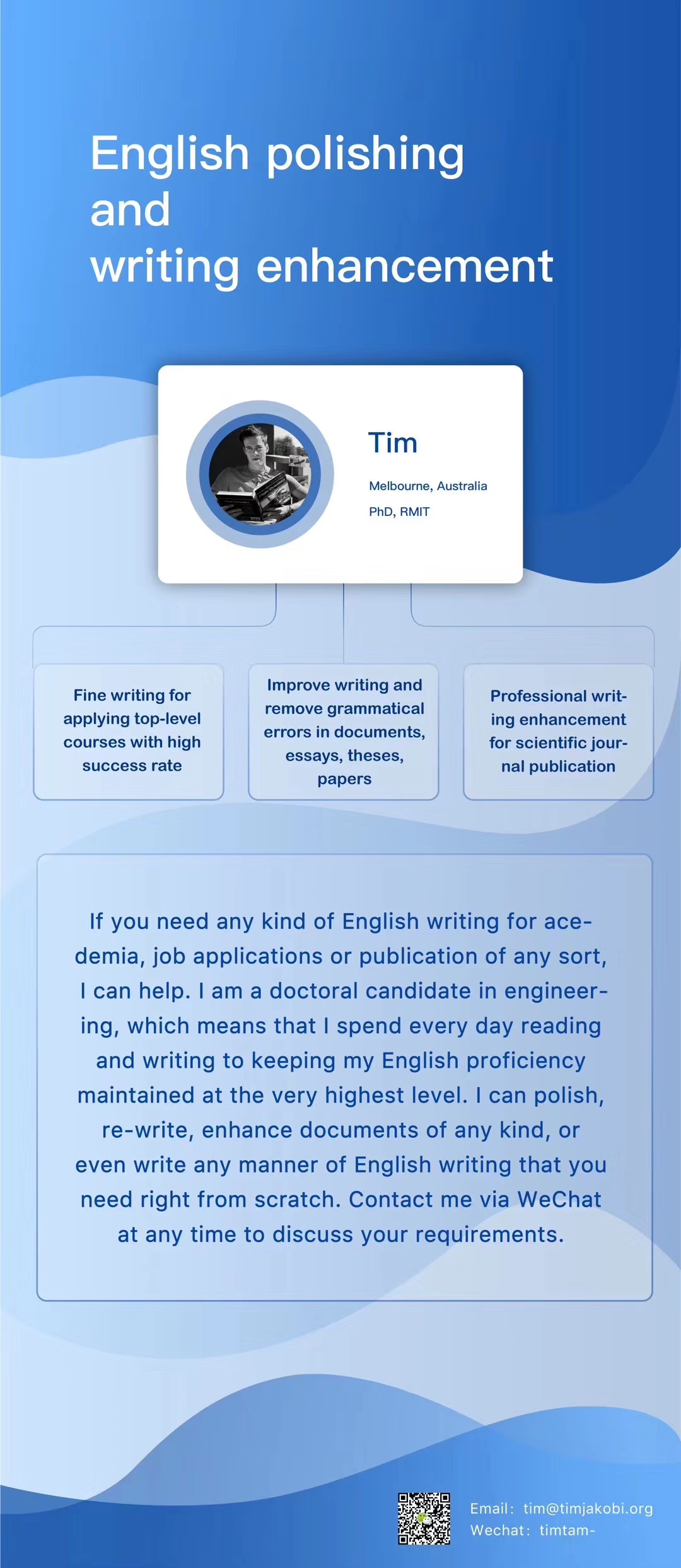 Language is the essence of a successful career. If you need anything writing or language-related, contact me and join the wechat group, maybe I can help you achieve that dream job or get into that perfect uni.