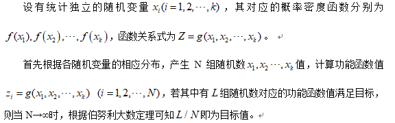由概率定义知,某事件的概率可以用大量试验中该事件发生的频率来估算。因此,可以先对影响其可靠度的随机变量进行大量的随机抽样,然后把这些抽样值一组一组地代入功能函数式,确定结构是否失效,最后从中求得结构的失效概率。蒙特卡罗法正是基于此思路进行分析的。