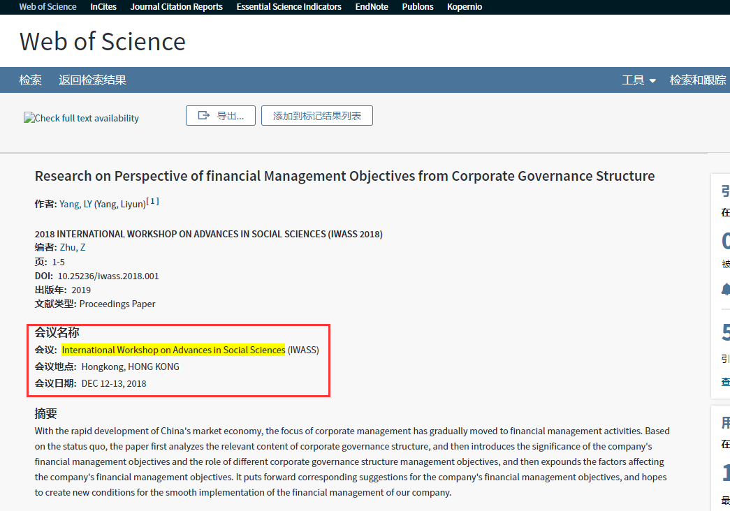 2018年社会科学发展国际会议(IWASS2018)CPCI检索结果
