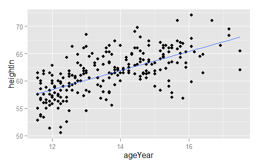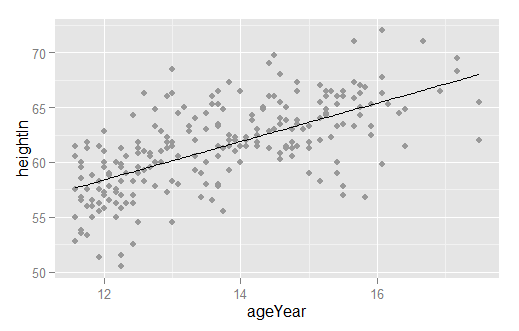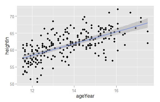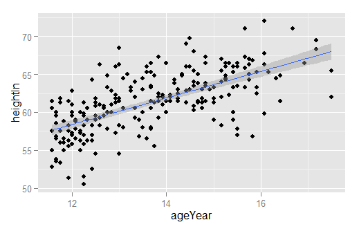 sp<-ggplot(heightweight,aes(x=ageYear,y=heightIn)) #heightweight是gcookbook中的一个数据框集合