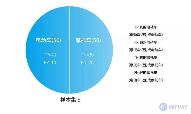 在识别给出的50个电动车目标中,其中只有40个是对的(TP:真的电动车),另外10个则识别错了(FP:假的电动车,实际是摩托车)。