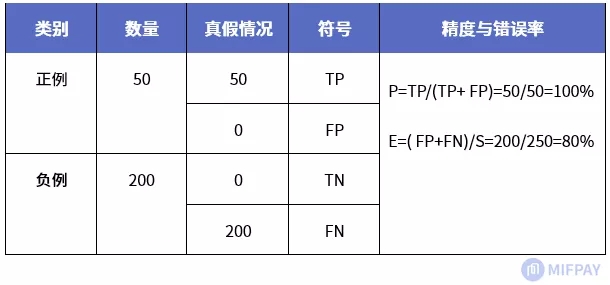 从上表可以看出,该模型识别结果给出正例50个,负例200个。在识别给出的50个正例当中全部都正确(都是真正例,没有伪正例),因而精度P为100%,非常高。但是识别给出的200个负例全部都错误(都是伪负例),错误率非常高,这样的模型性能其实非常低。