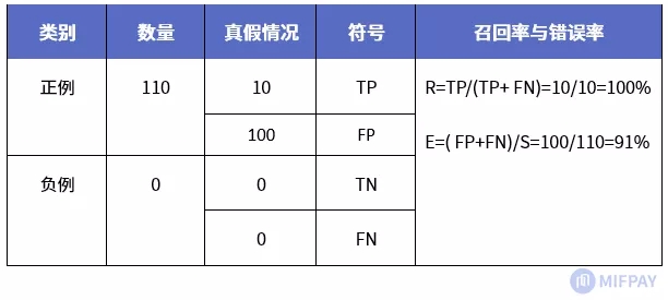上表可以看出,该模型识别结果给出正例110个,负例0个。在110个正例当中,其中10个是真正例(识别正确),100个却是伪正例(识别错误)。在这个测试数据集中,计算的召回率R为100%,非常好,也就是说,在这个数据集里总共有10个目标,已全部找到(召回)。但同时,计算得出模型识别结果的错误率E也很高,高达91%,所以这个模型性能也很低,基本不可靠。