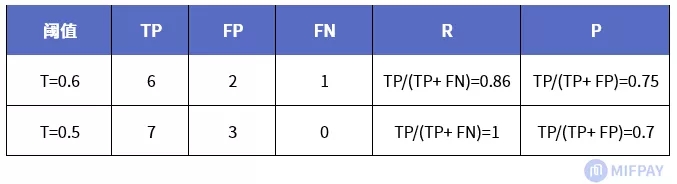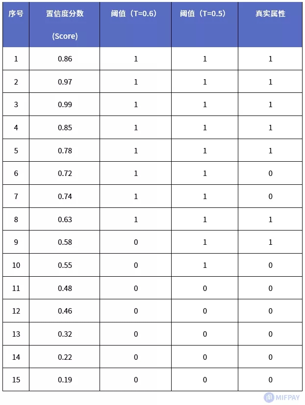 上表中1、0分别代表正例和负例。通过设定一个阈值(T),当置信度分数大于阈值则识别为正例,小于阈值则识别为负例。上表识别结果中当阈值T=0.6,模型给出的正例有8个,当阈值T=0.5,模型给出的正例则有10个。