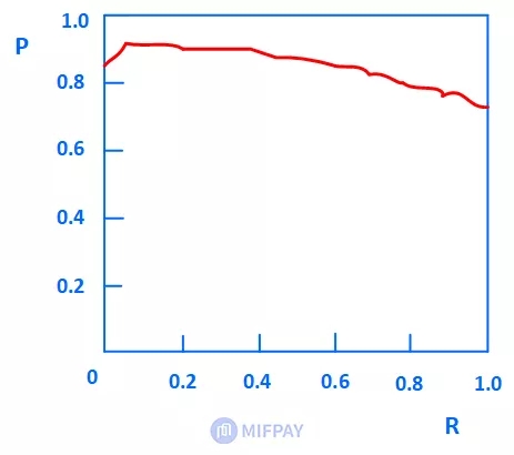 因此,PR曲线即是以召回率R为横轴,精度P为纵轴画出的曲线,如下图: