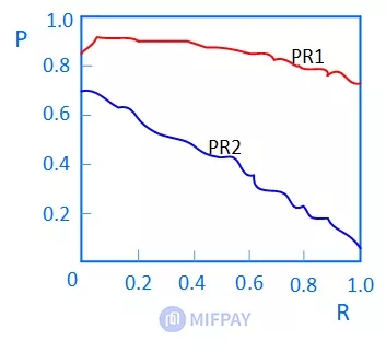 显然,这个面积的数值不会大于1。PR曲线下的面积越大,模型性能则越好。性能优的模型应是在召回率(R)增长的同时保持精度(P)值都在一个较高的水平,而性能较低的模型往往需要牺牲很多P值才能换来R值的提高。如下图所示,有两条PR曲线,可以看出,PR1曲线为性能较优的模型表现形式,PR1曲线下的面积明显大于PR2曲线下的面积。对于PR1曲线,随着R值的增长,P值仍能保持在一个较高的水平;而对于PR2曲线,随着R值的增长,P值则不断下降,因此是通过牺牲P值才能换得R值的提高。