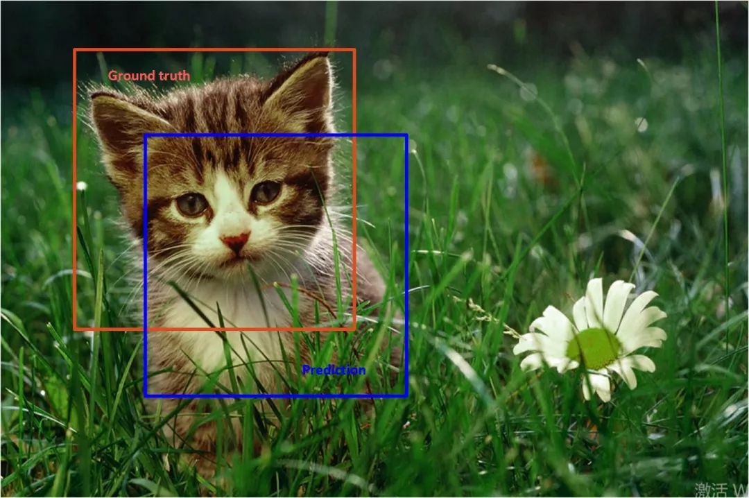 在目标检测中,IoU为预测框(Prediction)和真实框(Ground truth)的交并比。如下图所示,在关于小猫的目标检测中,紫线边框为预测框(Prediction),红线边框为真实框(Ground truth)。