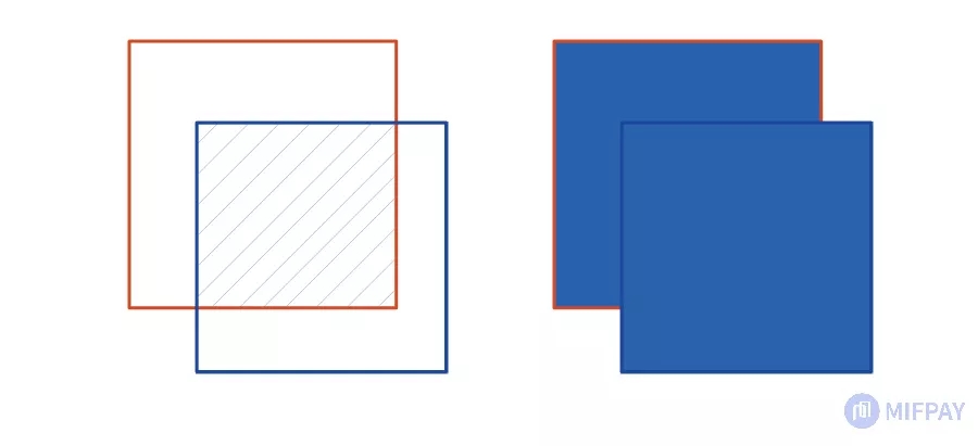 将预测框与真实框提取如下图,两者的交集区域为左下图斜线填充的部分,两者的并集区域为右下图蓝色填充的区域。IoU即为: