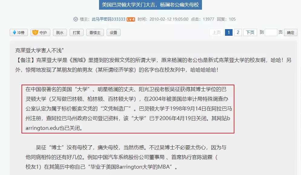 康得新招股书显示,王瑜出生于1974年,毕业于美国百林顿大学,获工商管理硕士学位。不过有趣的是,小强查遍公开资料,发现有关美国百林顿大学的公开信息少之又少。进一步深挖发现,2010年2月,天涯论坛有个很火的帖子,标题就叫“美国巴灵顿大学关门大吉,杨澜老公痛失母校”。该网帖提到的巴灵顿大学(Barrington),又译作巴林顿、柏林顿、百林顿大学。