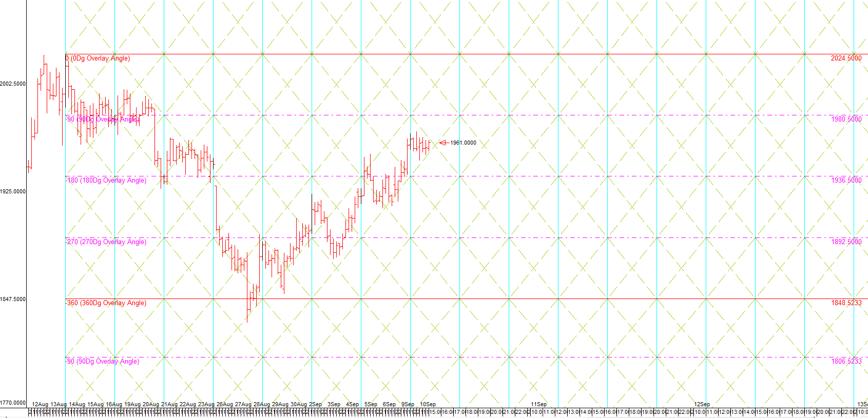 9.8d Normal FLD projection created on2019/9/2 projecting a price rise of 74.4583 to 1979.9170 by 2019/9/9. Thisprojection target was approached to within 0.5% of the target price on2019/9/10 and it seems unlikely to reach a new high before the completion of afull cycle and so it is being retired.