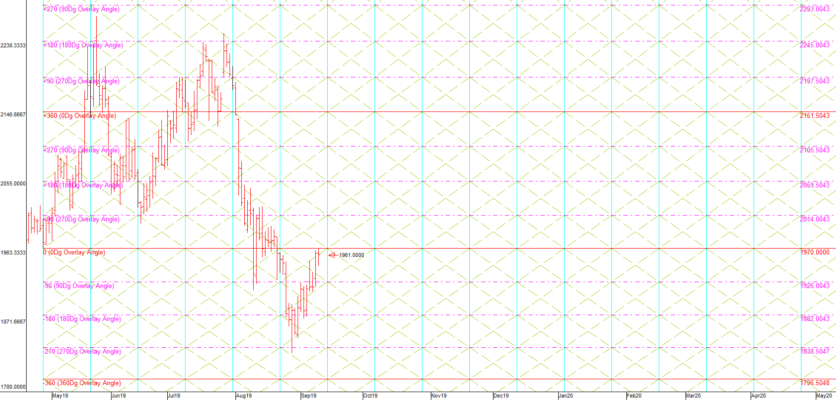 75.5d Mid-Channel Pause FLD projectioncreated on 2019/8/14 projecting a price fall of 149.2500 to 1807.7500 by2019/9/2. This projection target was approached to within 1.3% of the targetprice on 2019/8/28 and it seems unlikely to reach a new low before thecompletion of a full cycle and so it is being retired.